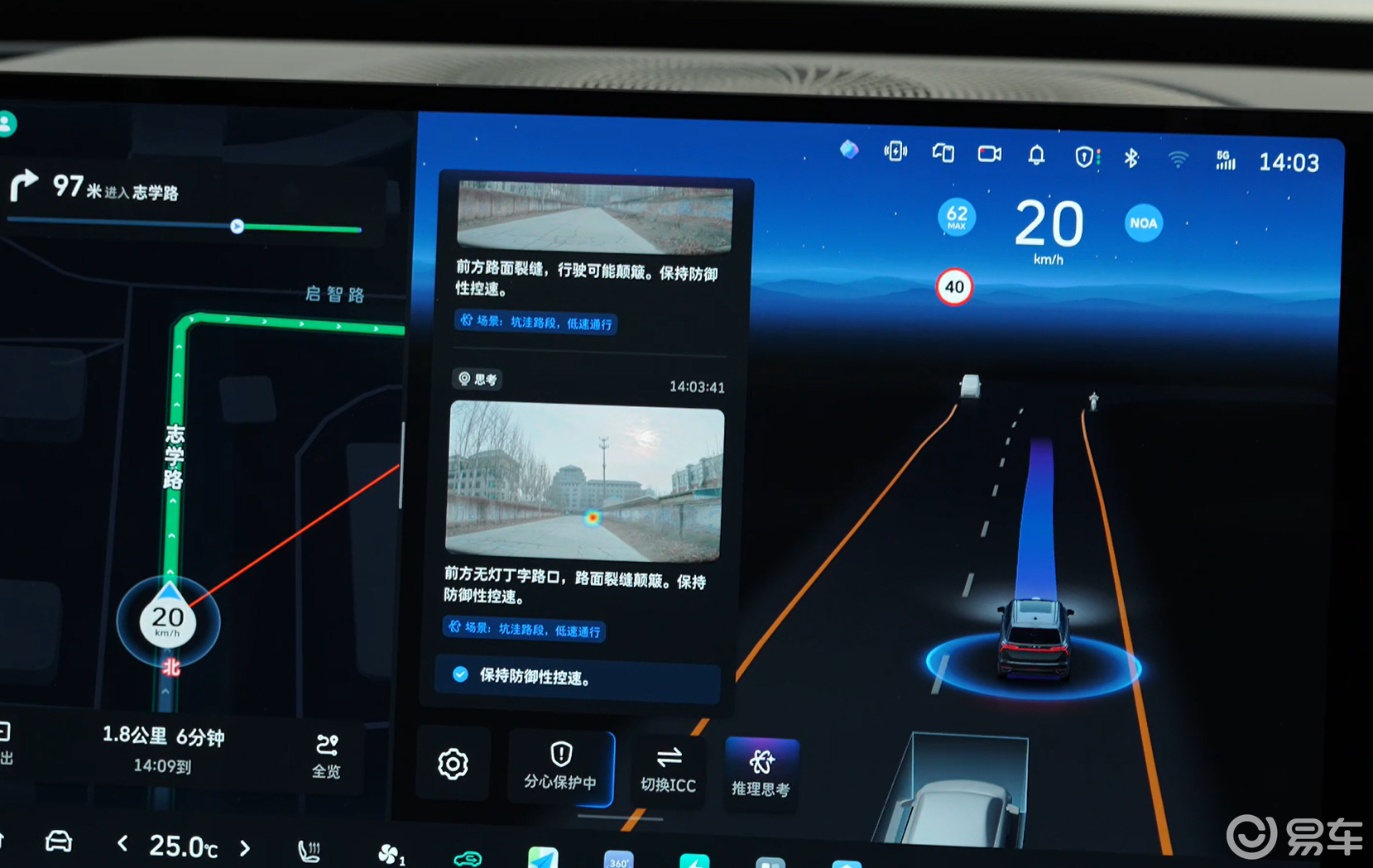 2. 提供思维卡片讲解。系统每做一个决定时,都会将当前行为的依据、判断路况的过程,用图文的形式显示在屏幕左侧,帮助驾驶者更快建立对VLA系统的信任。当然,把这个点单独拿出来说,是因为我认为它非常契合“人机共驾”理念——在它不断学习理解人类的同时,驾驶员也能够从这个思维卡片上看到“防御性驾驶”的实际演示。