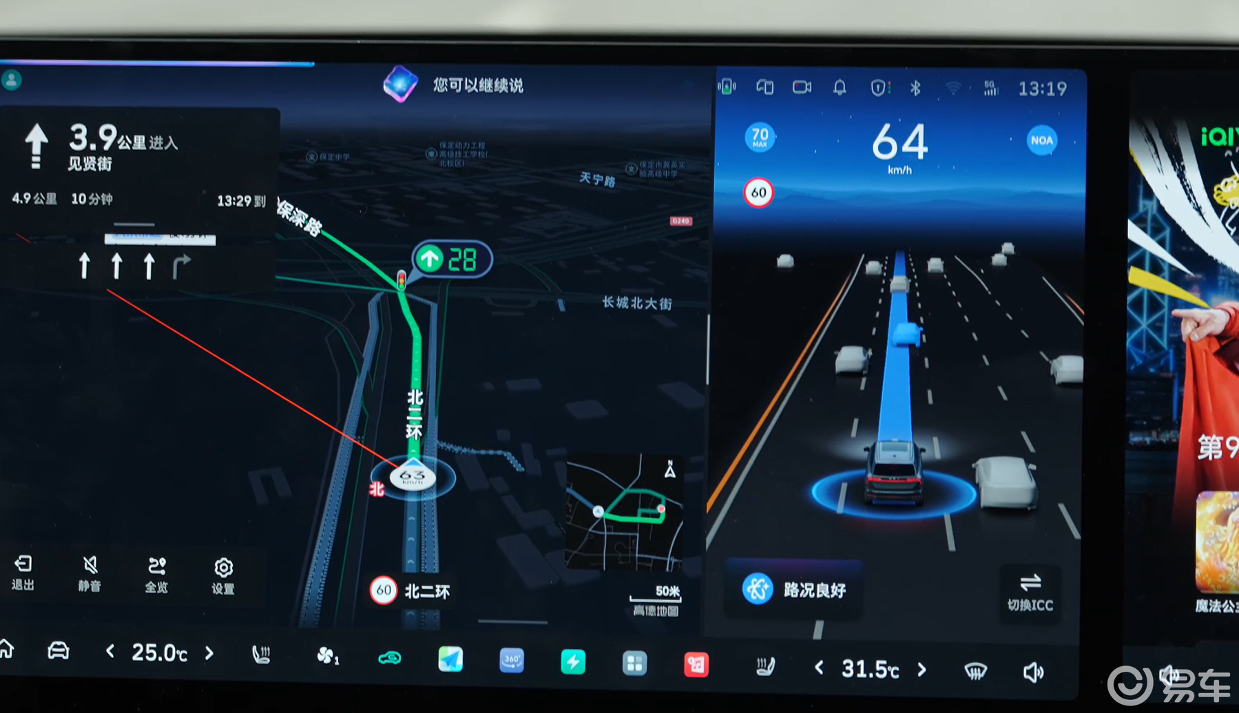 1. 支持语音发布指令。不管是开启/关闭NOA,调节车速或跟车距离,还是语音变道,它都能胜任。并且,指令下达后识别速度快、执行力高,这就保证了较高的通行效率。体验下来后,作为一个日常用车中对智能驾驶辅助依赖程度很低的司机来说,我也很愿意去使用它。