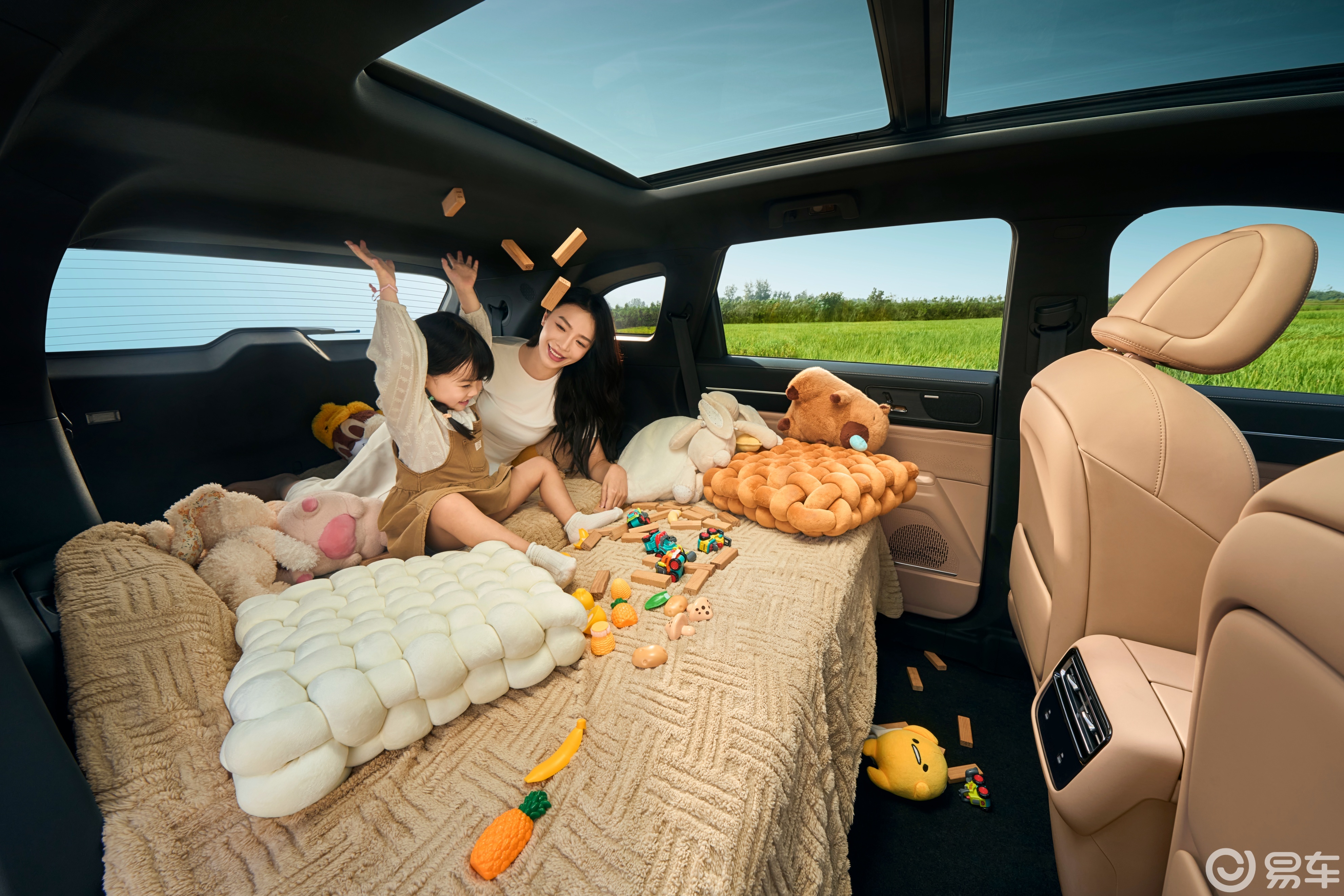 座椅也下了功夫,12层舒云座椅,加热、通风、按摩这些舒服的配置都有,不管是开车的还是坐车的,都能坐得舒舒服服。另外,全车43处收纳空间,全家出行零碎物件都有地方安置,8L容积的扶手箱装6瓶水没问题;五座版本后备厢732L,二、三排放倒后可以达到1708L,露营装备轻松装。