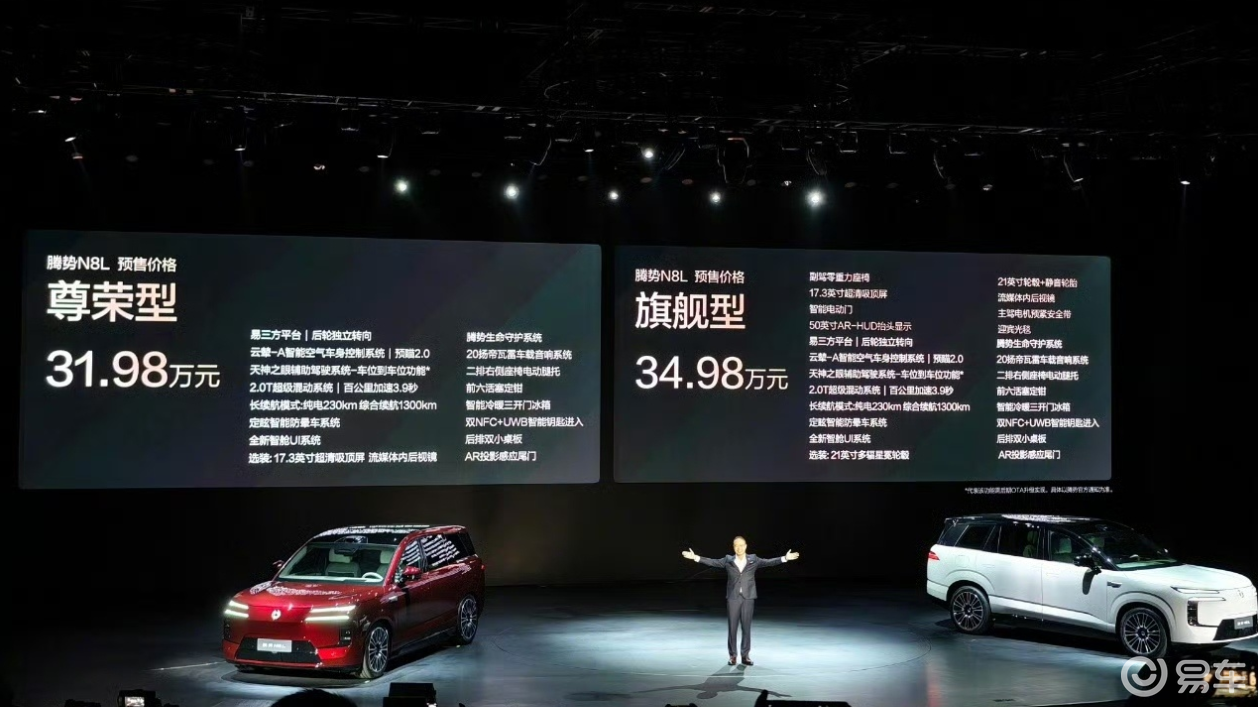 腾势N8L集易三方技术平台、5.2米级大车身、天神之眼驾驶辅助、云辇系统、2.0T超强动力系统等于一身,无疑是目前在售大六座车型中,技术最全面,最独特领先的。而腾势N8L除了三电机的动力外,还有明显的配置优势。并且,31.98万元起的预售价格,比前两者的价格明显低出一大截,极具性价比和市场竞争力。