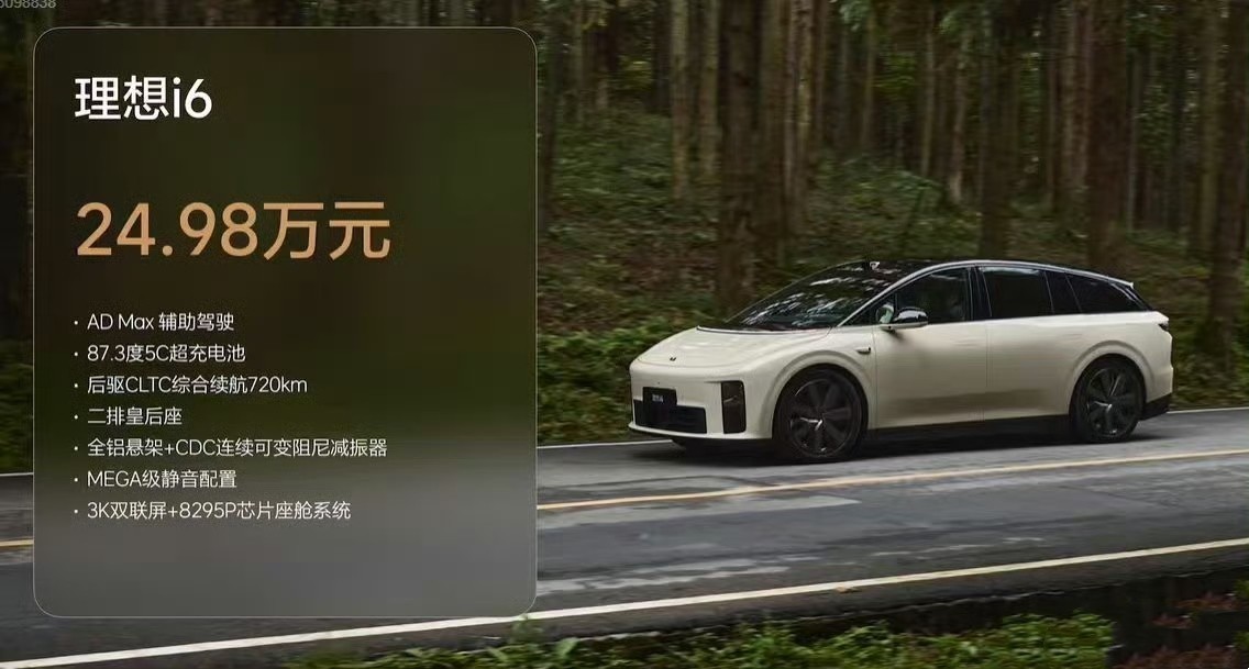 理想i6搭载87.3度的5C超充电池,后驱版本CLTC续航里程720公里。全车标配Nappa真皮座椅,并标配四座通风、五座加热和前排十点按摩,后排右侧配备皇后座椅。理想i6还标配全铝悬架、四个高性能液压衬套及CDC连续可变阻尼减振器。此外,理想i6标配AD Max高级辅助驾驶系统,搭载ATL全天候激光雷达和NVIDIA Thor-U芯片,支持VLA司机大模型。理想i6全国统一零售价24.98万元。