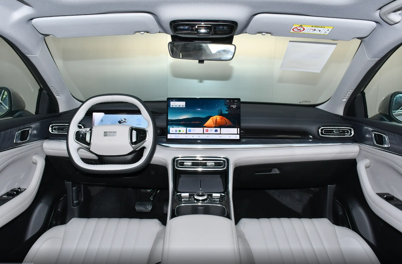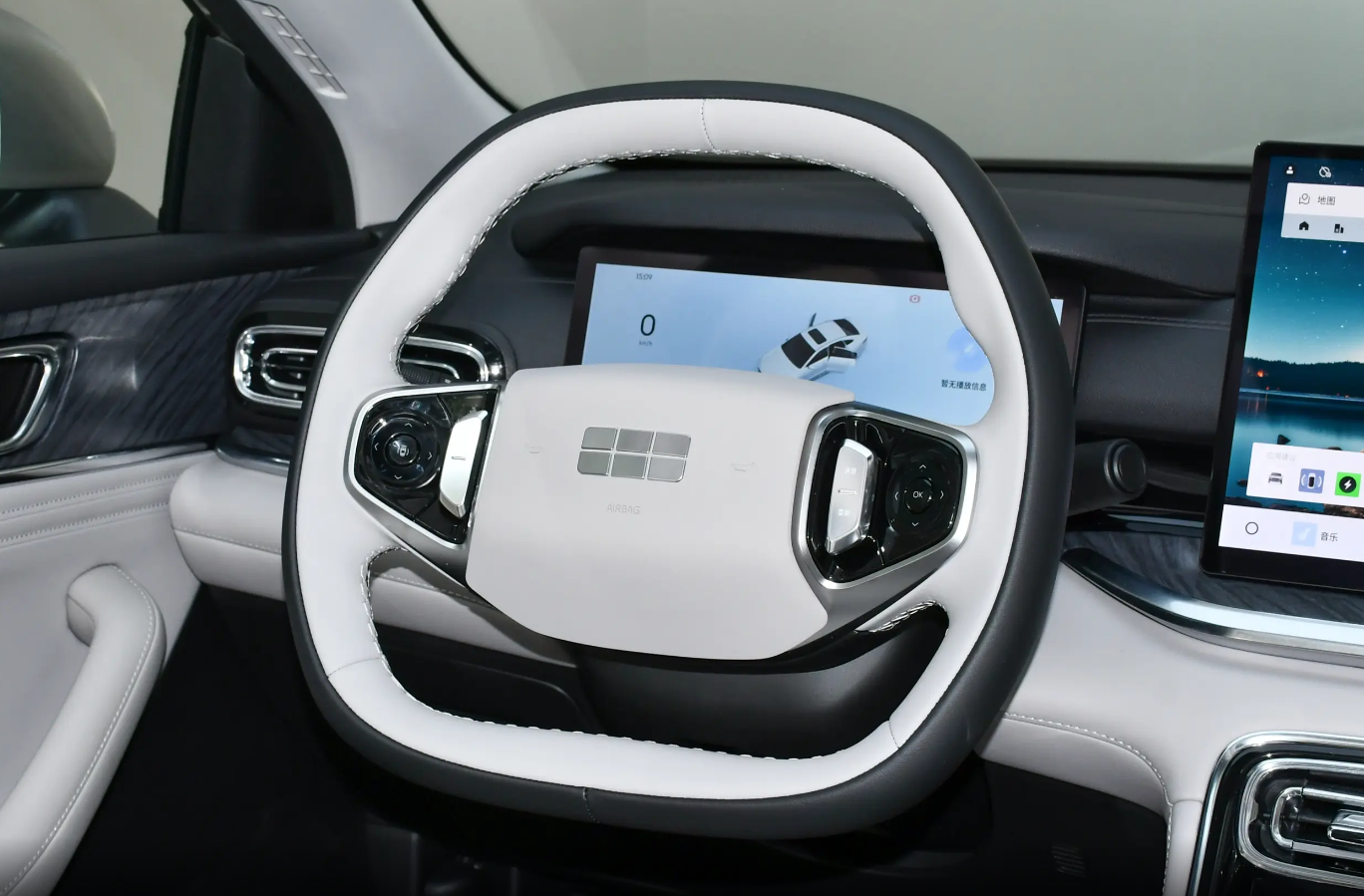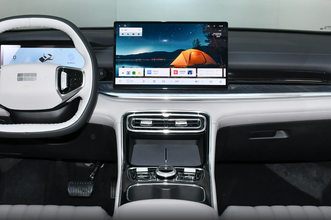 座舱内的设计与外观相呼应,吉利银河星耀6采用家族化内饰方案打造,多处软包材质包覆,优化了前排座舱的品质感。另外多处装饰还采用了质感细腻的镀铬元素点缀,辅以旋钮式钢琴烤漆功能实体按键,外加多处细密的缝线工艺来看,这个内饰设计对得起票价。方向盘的握持手感较为扎实,与中控屏搭配,提升了座舱的科技感。另外在车机配置上,该车使用7nm龍鹰一号芯片为14.6英寸车机屏提供算力支撑,支持AI语音识别控制、HiCar/Carlink互联,操作流畅度不逊色于10万+新能源车型。