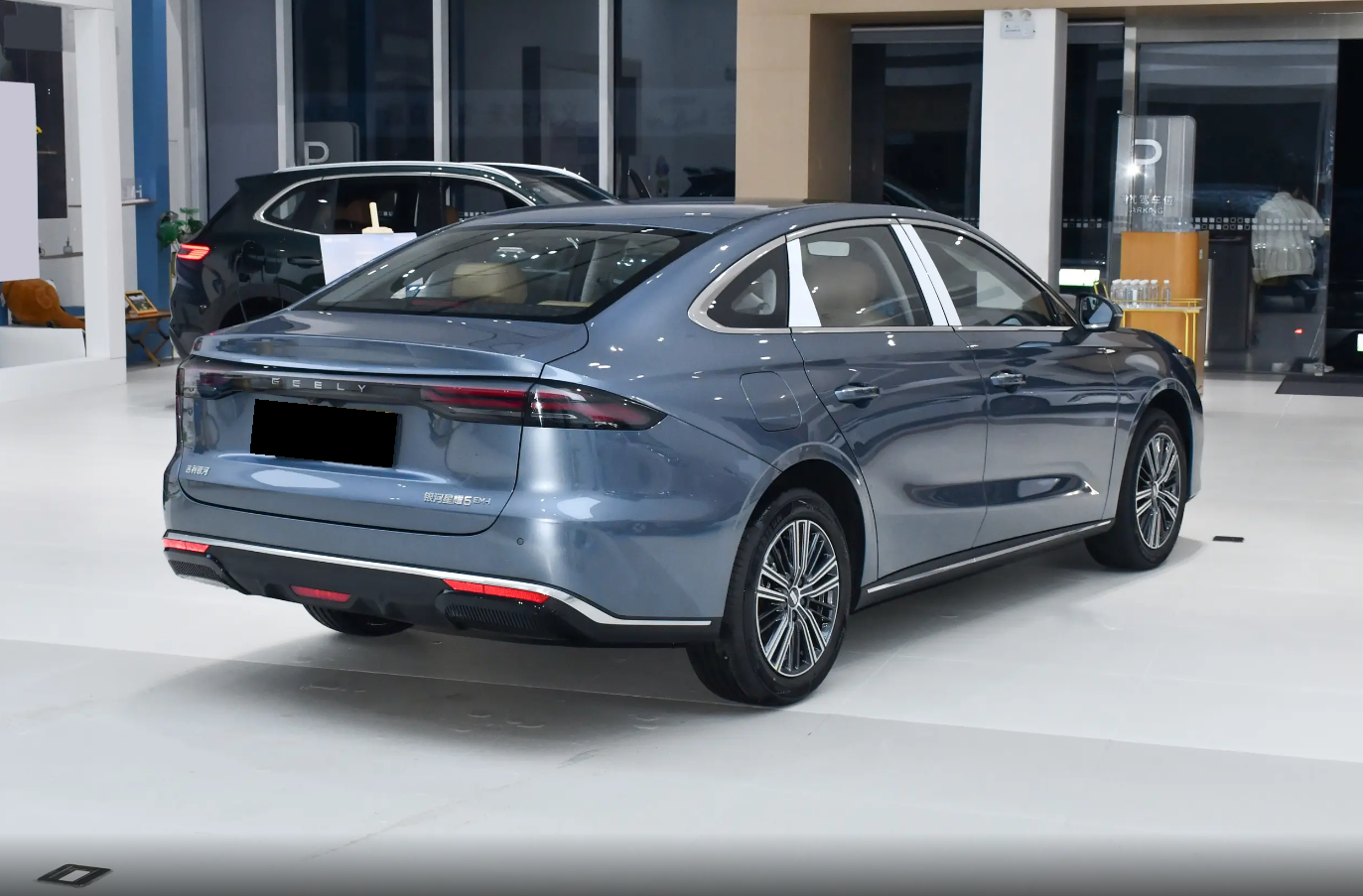 车身侧面的线条元素以平直舒展为主,腰线过渡丝滑顺畅,和一般轿车有所不同的是,侧裙与前后包围均带有一圈细长的镀铬饰条点缀,视觉效果有种合资B级车的高级感,而这也是近几年家用车常见的一种设计,放在星耀6身上并不觉得过时。尺寸方面,新车长宽高对应4806x1886x1490mm,轴距2756mm,按照车身体量来计算,是标准的A+级轿车,比速腾、思域等竞品车型更大,面对秦PLUS DM-i智驾版也有一定的优势。车尾的设计采用贯穿式LED尾灯布局,熏黑色灯腔内发光结构立体饱满,与中央“GEELY”品牌标识呼应,看起来简约大方,符合年轻消费群体的直觉审美。