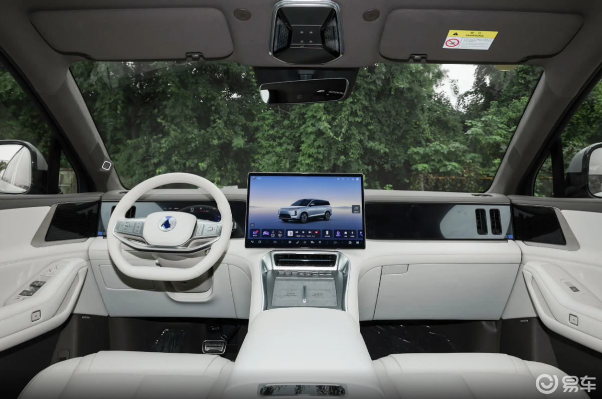 走进车内,腾势N8L采用了与腾势N9相似的内饰设计,环抱式结构布局加上大面积的软质材料包裹,营造出温馨舒适的座舱氛围,车内采用了17.3英寸的悬浮式中控屏与13.2英寸副驾娱乐屏的组合,加上13.2英寸仪表屏和50英寸AR-HUD,形成了多屏联动的人机交互体系。中央扶手区域配有双分区的手机无线充电板,后方则为较大尺寸的储物盒,提升了主副驾乘客的使用便利。