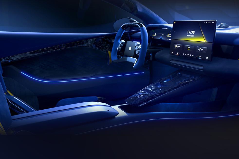 至于内饰,此前概念车已经展示过,配备有液晶仪表盘、中央信息娱乐屏幕以及一个供乘客使用的小型显示屏,以及采用可折叠设计的方向盘、碳纤维运动座椅以及防滚架座舱,妥妥高性能赛化规格。