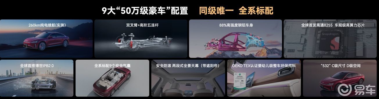 动力性能方面,风云A9L搭载了鲲鹏超能电混CDM 6.0系统,实现了260km纯电续航与1200km+综合续航,满足了多样化的出行需求。同时,车身采用了88%高强度钢铝材质,确保了整车的安全性。