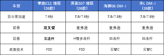 可以看到4台SUV的动力输出表现其实都差不多,都在7-8秒以内,而且都给底盘配备了软硬调节功能。但底盘结构上,零跑C11的表现稍微好一些,双叉臂+五连杆的结构在这个价位确实比较少见,要求高的朋友可以重点关注它。
