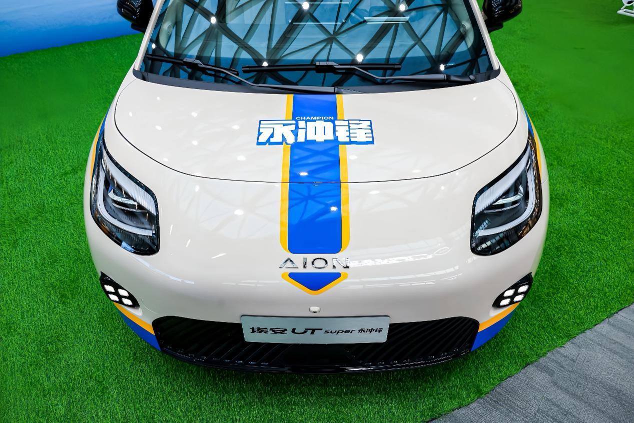 外观方面,延续埃安UT系列简约风格,核心差异在于专属“永冲锋”冠军车衣,以“永州蓝”为底色搭配埃安独角北鼻元素。前脸配备封闭式格栅与熏黑LED透镜大灯,日间行车灯辨识度较高;前包围两侧为四点式光源,中间设黑色进气口;车身配备半隐藏式门把手,车尾搭载熏黑垂直尾灯,与前灯组形成呼应。