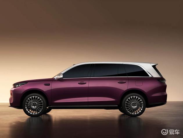车身侧面,撞色车身成为最显著的特征,车顶为银色,车身为带有玫红色风格的紫色,配以大量镀铬装饰和夸张的亮面多幅轮毂,显得相当大气。传统车门把手符合国家新规,车身尺寸为52.9/2025/18.5毫米,轴距为3.50毫米,确保了6座布局的出色空间表现,也彰显了旗舰车型的定位。车尾部分则相对简洁,尾灯尺寸较小,但光源科技感十足,与整车设计相得益彰。