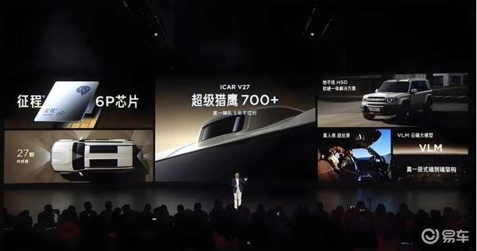 作为硬派 SUV 品类中少见的智能先锋,iCAR V27 的智驾硬件堪称同级顶配。核心搭载的地平线征程 6P 芯片,算力高达 560TOPS,为全场景辅助驾驶提供坚实算力支撑,官方承诺 “五年不过时”,适配未来 OTA 升级需求。整套 “超级猎鹰 700+” 辅助驾驶系统,配备 27 颗高性能传感器,包括高精度激光雷达、800 万像素双目摄像头、毫米波雷达及超声波雷达,构建 3.0° 无死角感知网络,无论是城市复杂路况还是郊野探索场景,都能精准捕捉环境信息。
